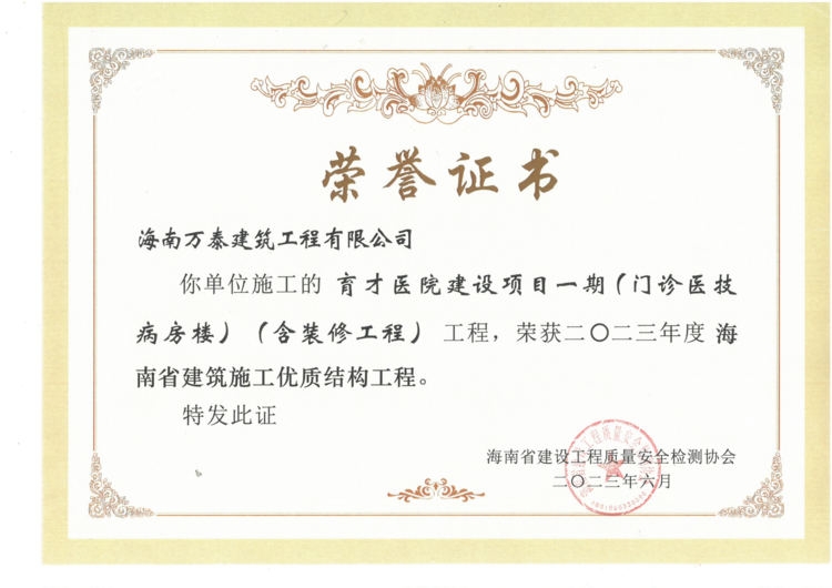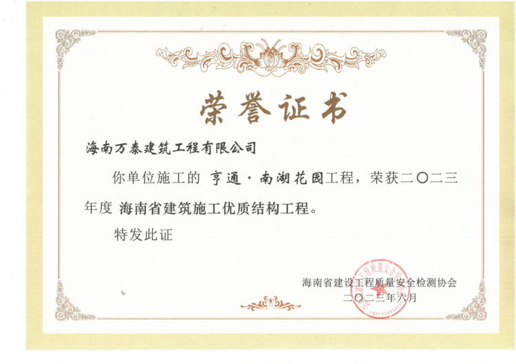 近日,由公司承建的育才醫院建設項目一期、保亭黎族苗族自治縣人民法院審判法庭建設項目、亨通·南湖花園分別通過了海南省建設工程質量安全檢測協會的評審,被評為“2023年度海南省建筑施工優質結構工程”。該獎項代表著全省建筑工程結構施工質量的領先水平,是精品工程的重要標志。