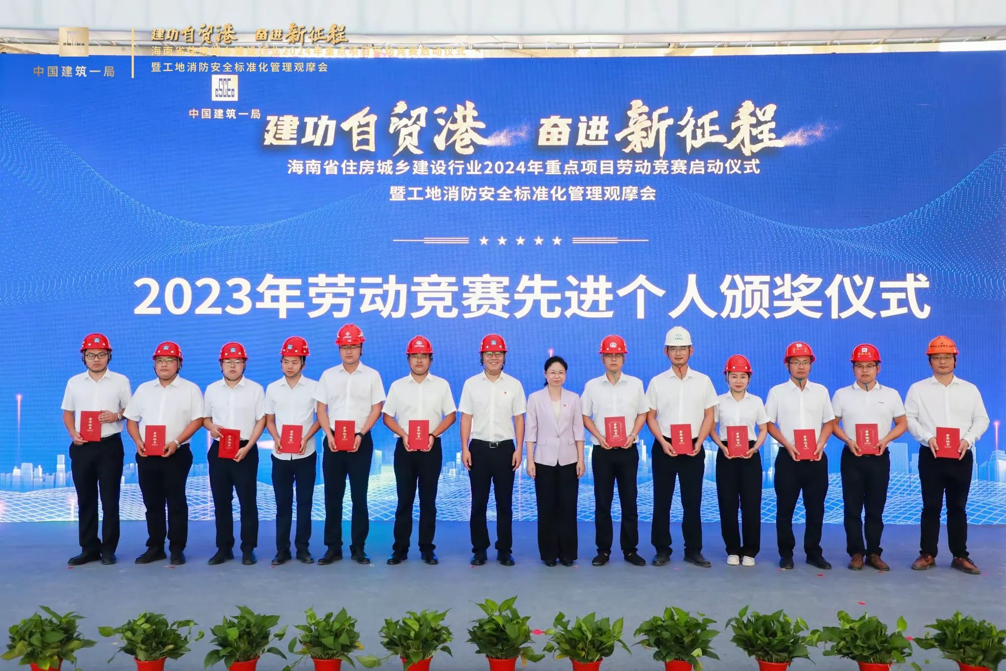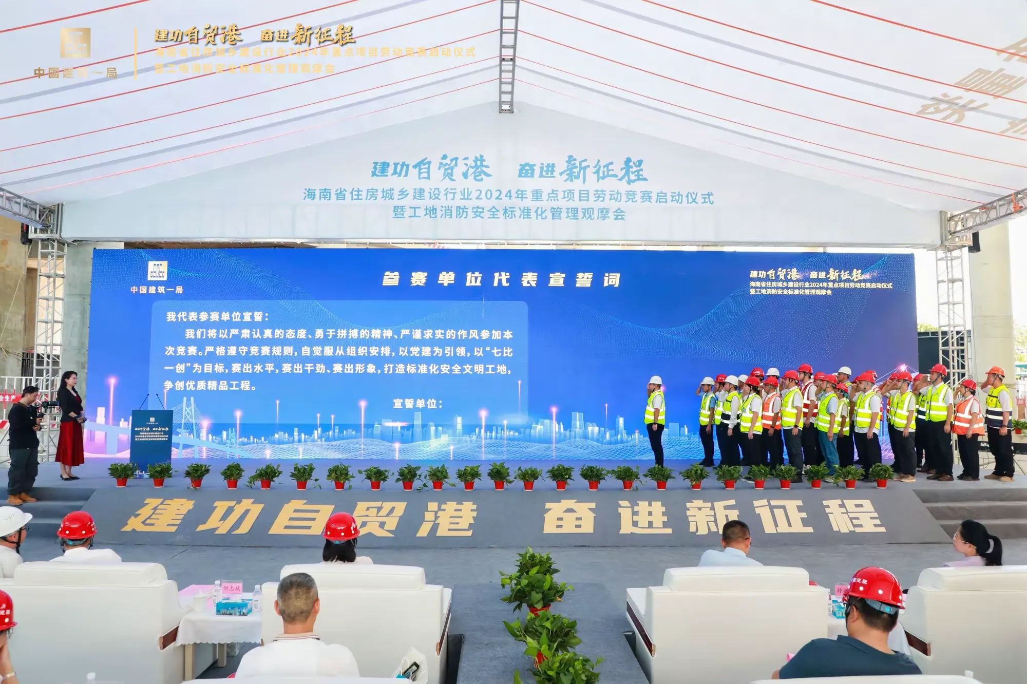 在啟動儀式現場,公司林慧同志作為29名海南省住房城鄉建設行業2023年重點項目勞動競賽“先進個人”之一上臺領獎,張豪杰同志作為公司代表上臺進行參賽單位宣誓。本次勞動競賽以“七比一創”為主要內容,即“比黨建引領、比工程進度、比工程質量、比安全生產、比科學管理、比技術創新、比文明施工、創優質工程”,進一步激發廣大職工不斷提升自身能力水平,勇于奉獻、干事創業的熱情。