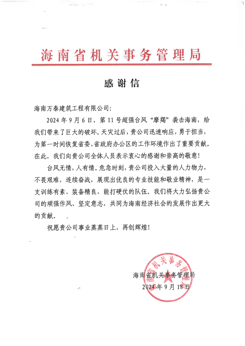 近日,海南萬泰建筑工程有限公司收到一封來自海南省機關事務管理局的感謝信。信中感謝了海南萬泰公司在臺風剛過后,迅速響應,勇于擔當,組織力量投入超強臺風“摩羯”災后的道路清障工作,為第一時間恢復省委、省政府辦公區的工作環境作出了重要貢獻。