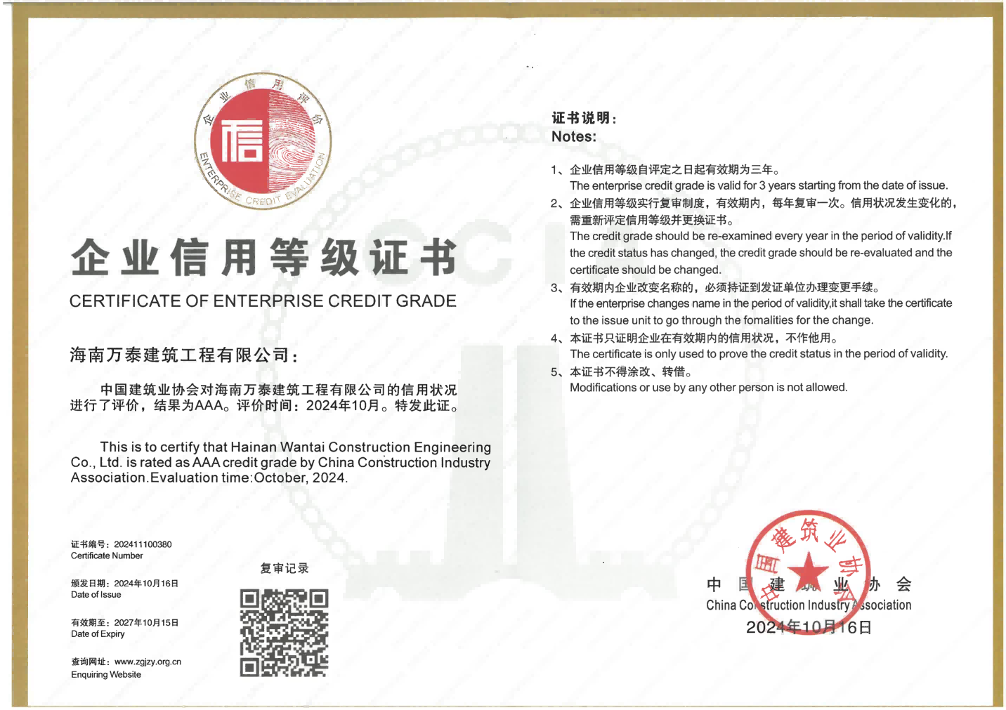 該評價由中國建筑業協會組織評定,是國家級建筑業企業綜合能力最高評價。主要對企業基本素質、誠信履約、經營能力及財務指標、管理能力等主要指標進行全方位考核,每年評定一次,評價結果有效期3年(期間復審2次),AAA級是最高信用等級,代表著對企業在積極履行社會責任、誠信經營、信用記錄良好等方面的充分肯定。