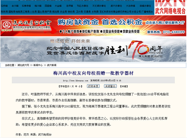 梅川高中校友張小龍向母校捐贈一批教學器材