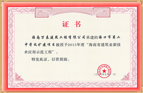 由海南萬泰建筑工程有限公司承建的“海口市第二中學(xué)改擴(kuò)建項(xiàng)目”被海南省住房和城鄉(xiāng)建設(shè)廳授予2015年度“海南省建筑業(yè)新技術(shù)應(yīng)用示范工程”。