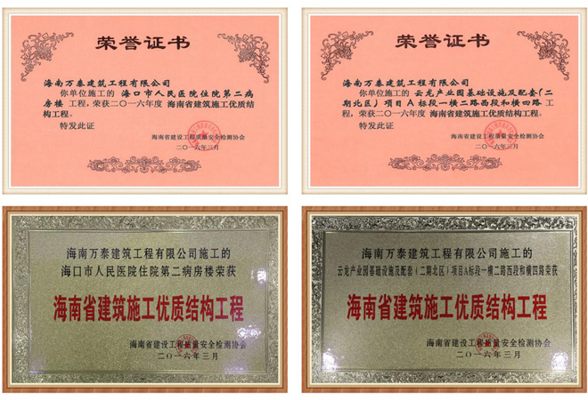 2016年3月,由海南萬泰建筑工程有限公司承建的“海口市人民醫院住院第二病房樓”及“云龍產業園基礎設施及配套(二期)項目”工程被海南省建設工程質量安全檢測協會評為《海南省建筑施工優質結構工程》榮譽稱號。